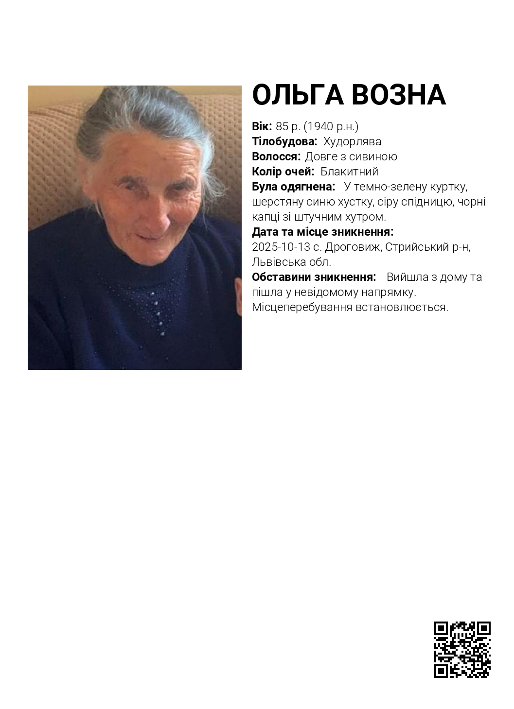 Обставини зникнення: Вийшла з дому та пішла у невідомому напрямку. Місцеперебування встановлюється.