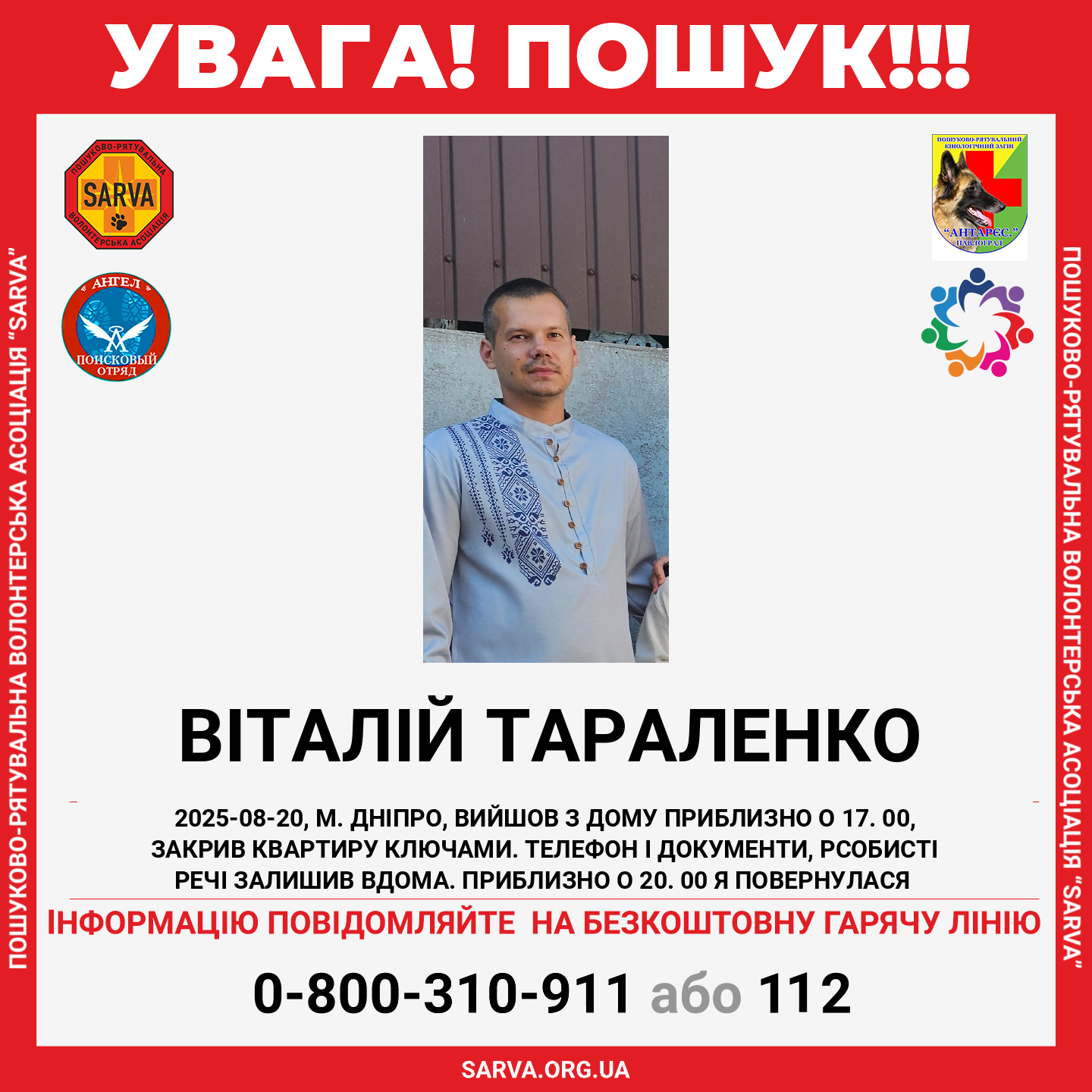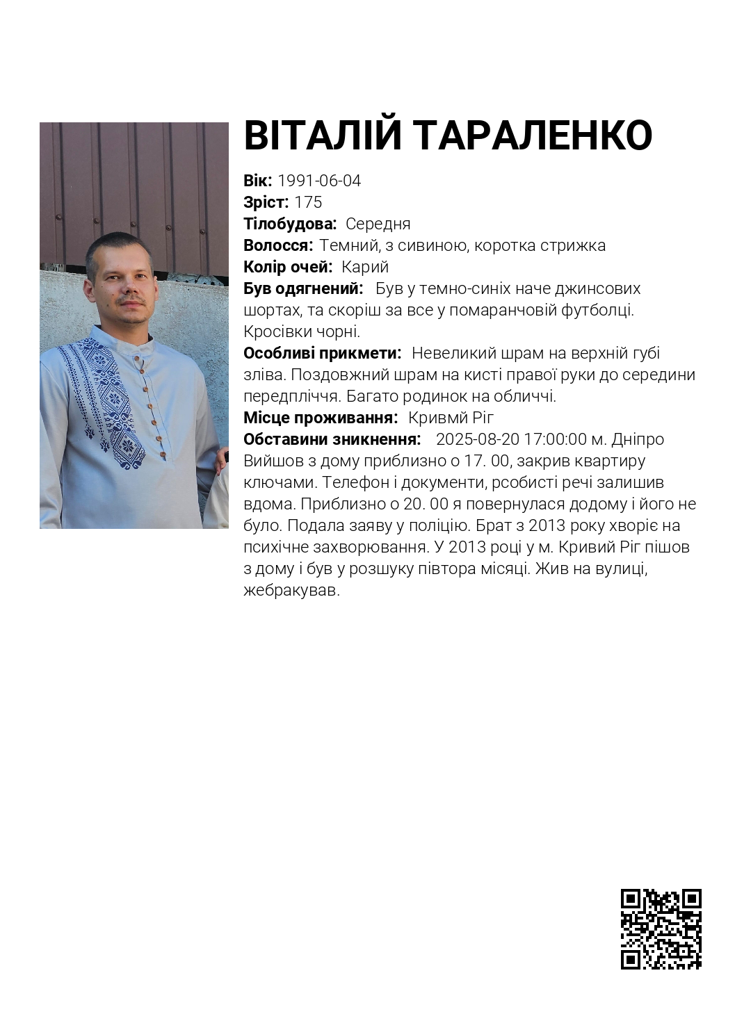 Обставини зникнення: Вийшов з дому приблизно о 17. 00, закрив квартиру ключами. Телефон і документи, рсобисті речі залишив вдома. Приблизно о 20. 00 я повернулася додому і його не було. Подала заяву у поліцію. Брат з 2013 року хворіє на психічне захворювання. У 2013 році у м. Кривий Ріг пішов з дому і був у розшуку півтора місяці. Жив на вулиці, жебракував.